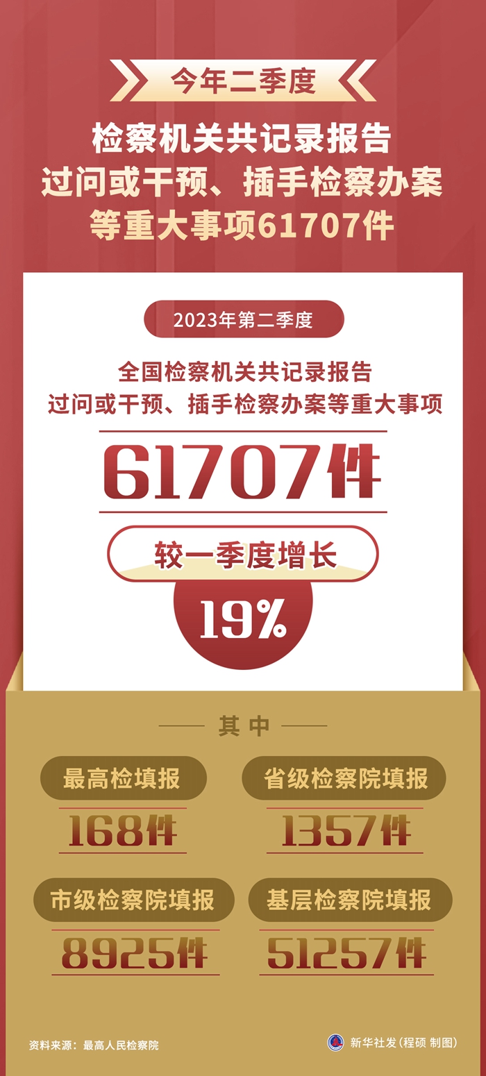 新华社北京7月18日电(记者冯家顺)记者18日从最高人民检察院获悉,2023年第二季度,全国检察机关共记录报告过问或干预、插手检察办案等重大事项61707件,较一季度增长19%。其中,最高检填报168件,省级检察院填报1357件,市级检察院填报8925件,基层检察院填报51257件。