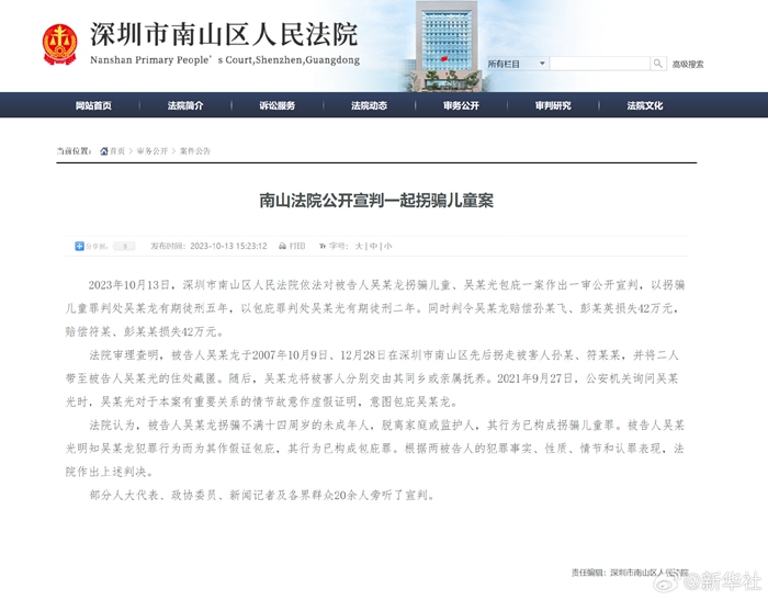 2023年10月13日,深圳市南山区人民法院依法对被告人吴某龙拐骗儿童、吴某光包庇一案作出一审公开宣判,以拐骗儿童罪判处吴某龙有期徒刑五年,以包庇罪判处吴某光有期徒刑二年。同时判令吴某龙赔偿孙某飞、彭某英损失42万元,赔偿符某、彭某某损失42万元。