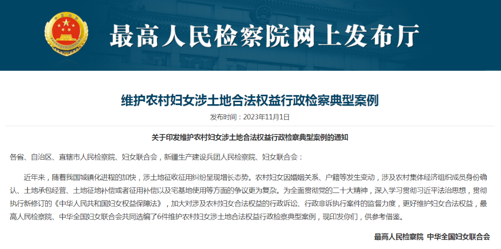 记者11月1日从最高人民检察院获悉,最高检、全国妇联近期联合印发了维护农村妇女涉土地合法权益行政检察典型案例。