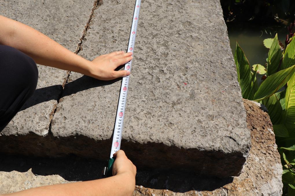 办案检察官在现场测量古桥桥面板长度。(王菁 摄)