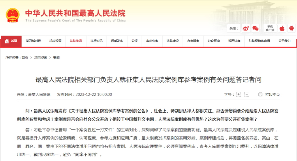 12月22日,最高人民法院发布关于征集人民法院案例库参考案例的公告,并回应中国裁判文书网的有关问题。