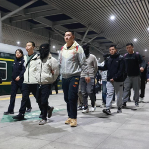 这是专案组民警在押解被抓获的犯罪嫌疑人。(杜星宇 摄)