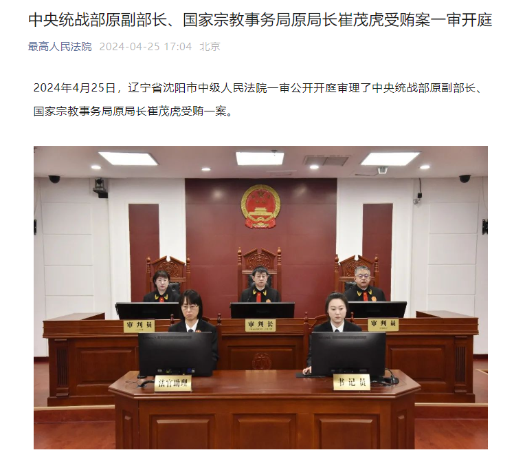 2024年4月25日,辽宁省沈阳市中级人民法院一审公开开庭审理了中央统战部原副部长、国家宗教事务局原局长崔茂虎受贿一案。