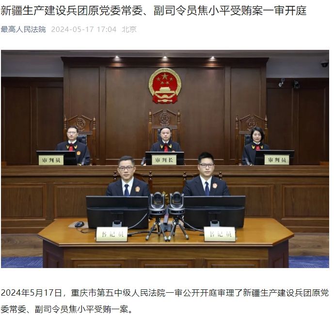 2024年5月17日,重庆市第五中级人民法院一审公开开庭审理了新疆生产建设兵团原党委常委、副司令员焦小平受贿一案。