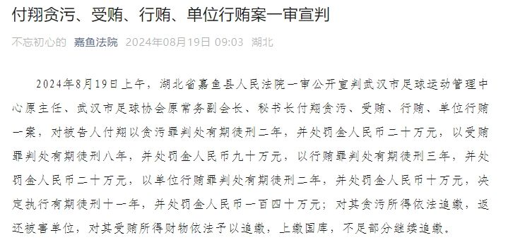 2024年8月19日上午,湖北省嘉鱼县人民法院一审公开宣判武汉市足球运动管理中心原主任、武汉市足球协会原常务副会长、秘书长付翔贪污、受贿、行贿、单位行贿一案,对被告人付翔以贪污罪判处有期徒刑二年,并处罚金人民币二十万元,以受贿罪判处有期徒刑八年,并处罚金人民币九十万元,以行贿罪判处有期徒刑三年,并处罚金人民币二十万元,以单位行贿罪判处有期徒刑二年,并处罚金人民币十万元,决定执行有期徒刑十一年,并处罚金人民币一百四十万元;对其贪污所得依法追缴,返还被害单位,对其受贿所得财物依法予以追缴,上缴国库,不足部分继续追缴。