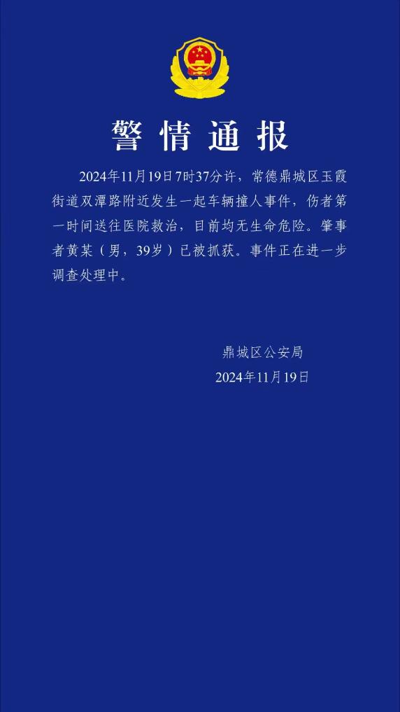 记者从湖南省常德市鼎城区公安局了解到,11月19日7时37分许,常德鼎城区玉霞街道双潭路附近发生一起车辆撞人事件,伤者第一时间送往医院救治,目前均无生命危险。肇事者黄某(男,39岁)已被抓获。事件正在进一步调查处理中。(记者周勉、帅才)