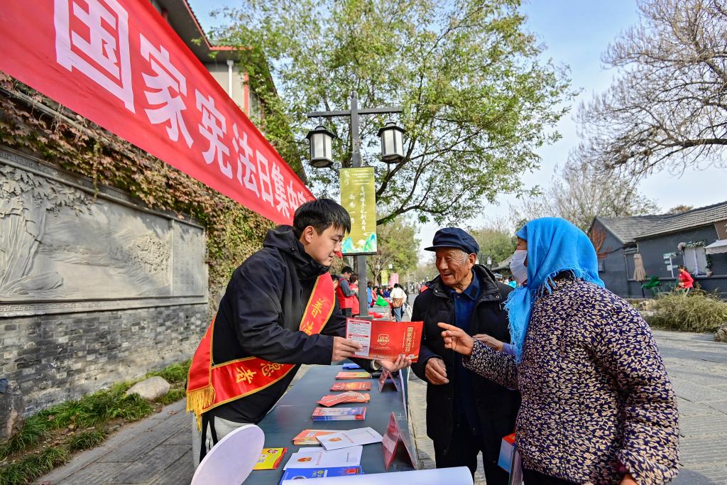 12月4日,在山东省青州市,当地司法机关的普法志愿者为群众讲解宪法知识。新华社发(王继林 摄)
