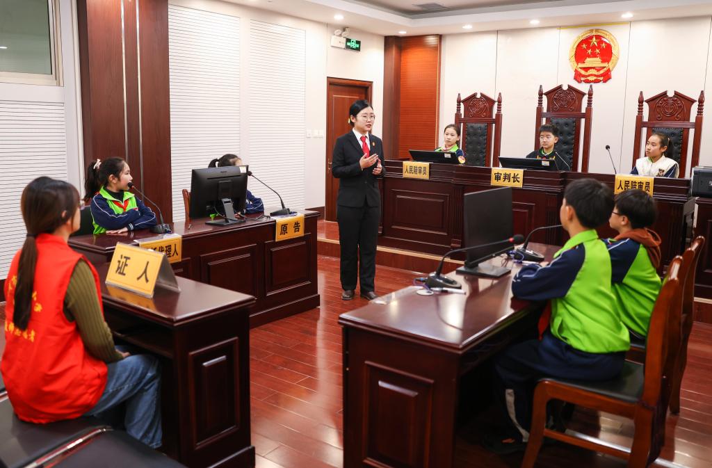 12月4日,在山东省荣成市人民法院民事审判庭,学生沉浸式体验模拟法庭。新华社发(李信君 摄)