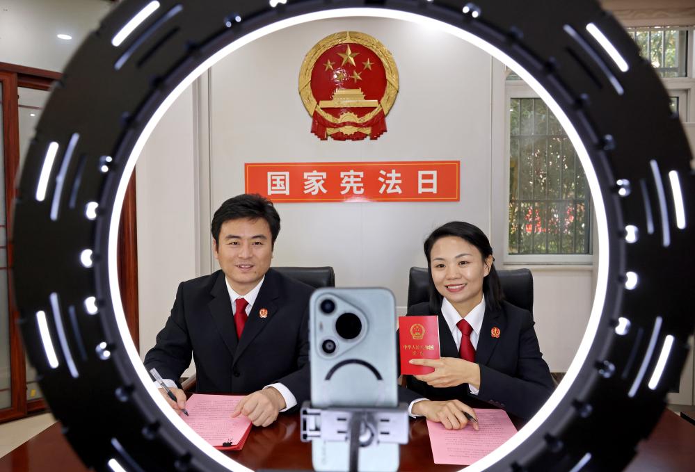 12月3日,山东省枣庄市市中区人民法院的两名法官通过直播向观众宣传宪法知识。新华社发(孙中喆摄)