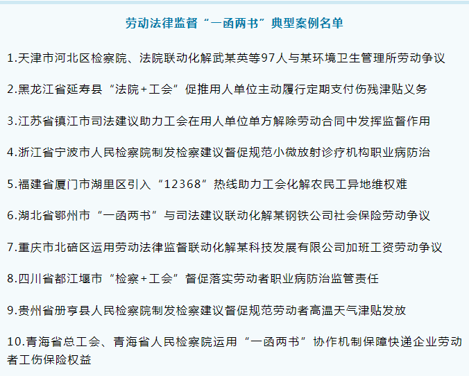 12月27日,全国总工会、最高人民法院、最高人民检察院发布10件劳动法律监督“一函两书”典型案例。