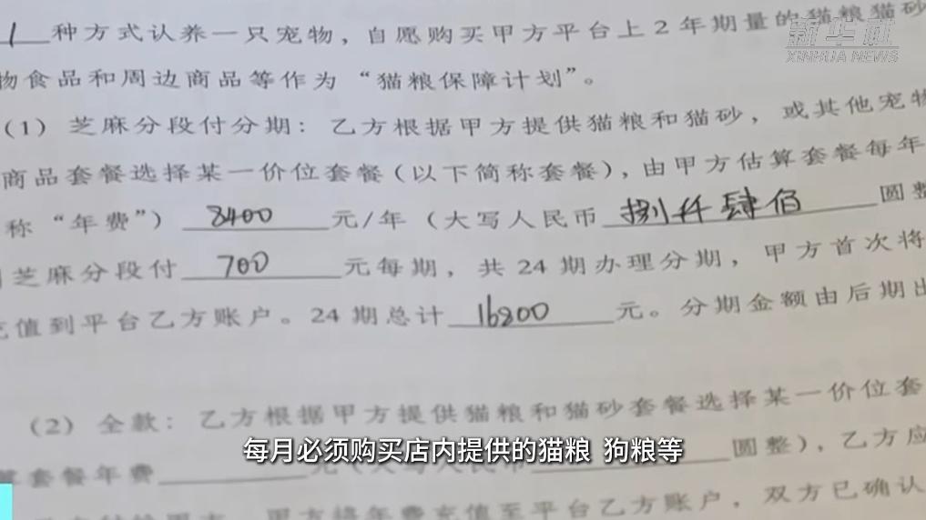 宠物免费送,但领养过程中消费者需签订24个月合同,每月必须购买店内提供的猫粮、狗粮等,费用按品种不同从200元至500元不等。网络上,一些消费者投诉自己被诱导签订分期付款服务,“免费领养”变成了“信用贷”。
