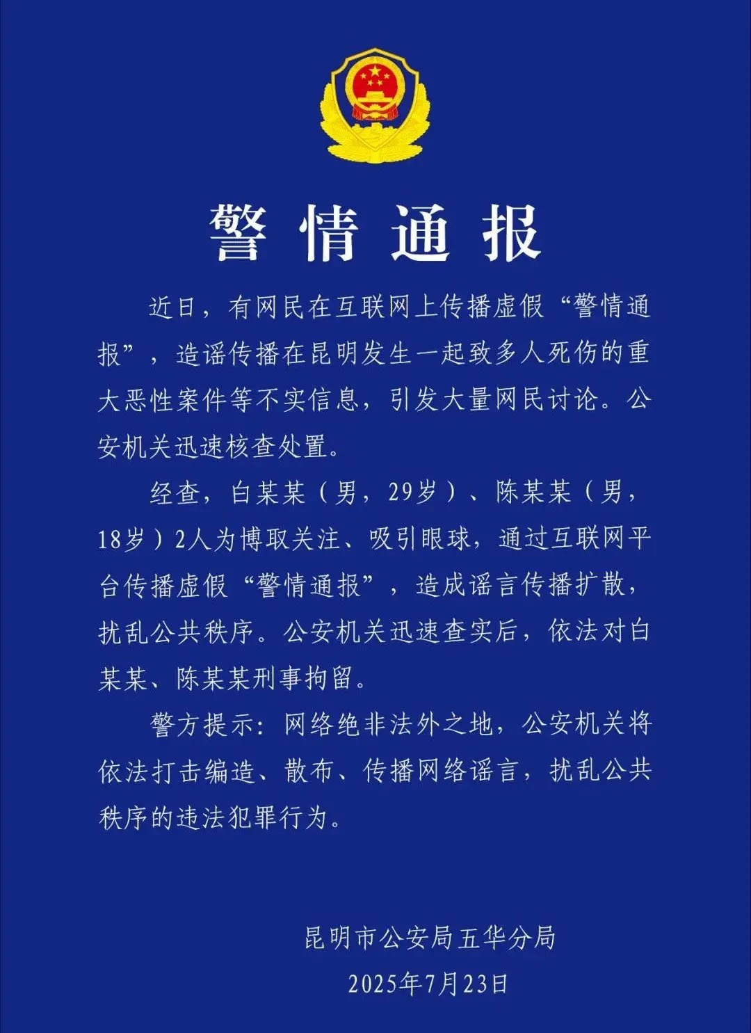 近日,一份虚假“警情通报”在互联网上传播,谣称“昆明市金马坊路段发生一起犯罪嫌疑人驾车冲撞行人的重大恶性案件,致131人死亡,337人受伤”,误导大量网民关注、讨论。公安机关迅速核查处置。