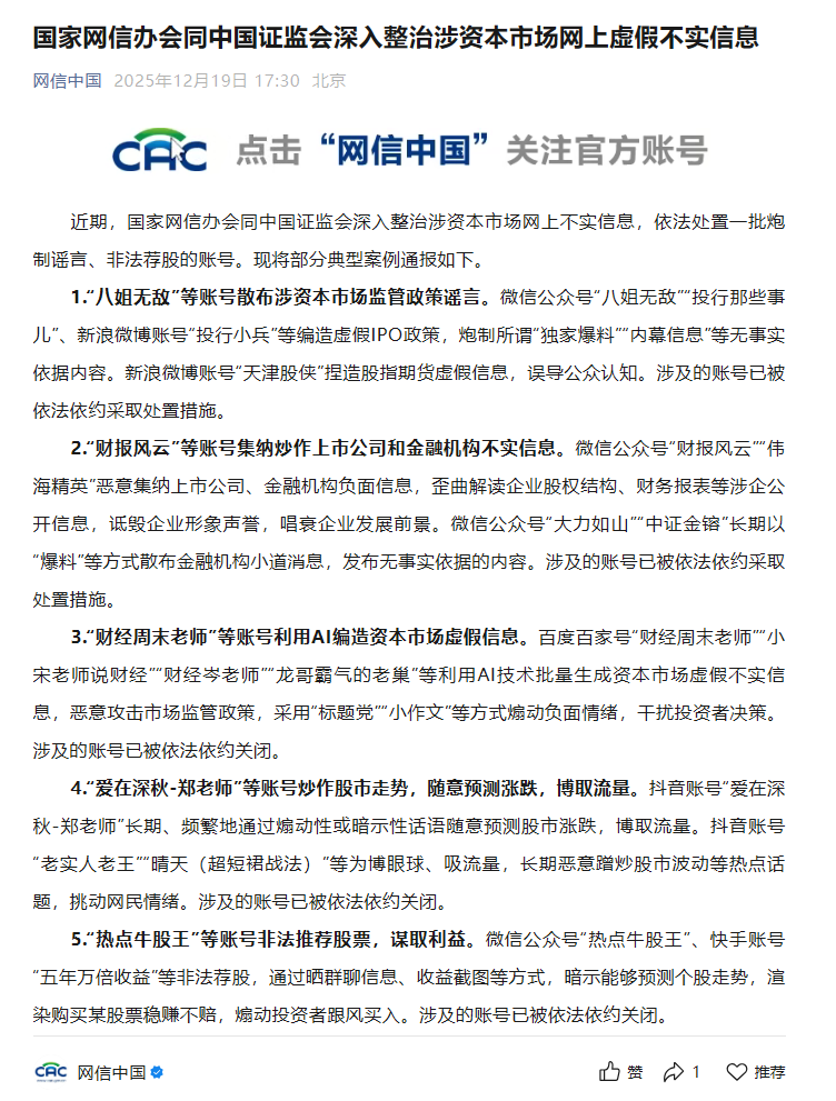 近期,国家网信办会同中国证监会深入整治涉资本市场网上不实信息,依法处置一批炮制谣言、非法荐股的账号。现将部分典型案例通报如下。
