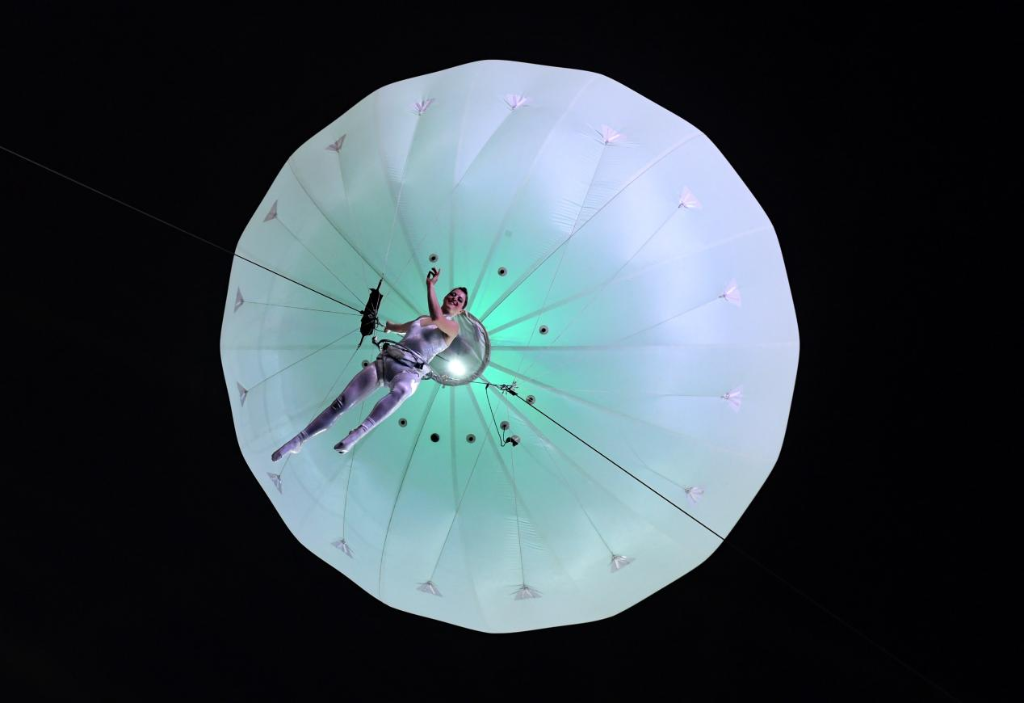 一名空中芭蕾演员悬挂在直径6米的氦气球下表演。新华社记者李紫恒摄