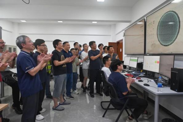 8月26日,科研人员在江门中微子实验运行控制室共同开启物理取数,鼓掌庆祝取数成功。新华社发(刘悦湘 摄)