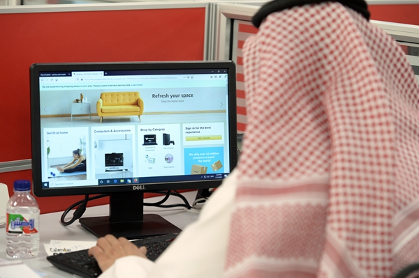 一名男子在科威特费尔瓦尼耶省的办公室里浏览网上商品。(新华社)