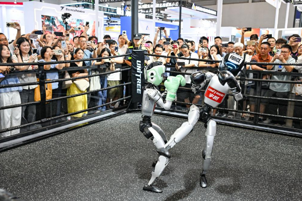 在智博会N3展馆,一个精心设置的小型“格斗场”被观众围得水泄不通。两台宇树科技的人形机器人拉开架势,正在进行一场令人惊叹的拳击赛。它们拳来脚往,倒地后五秒之内就自主站立起身,动作麻利。