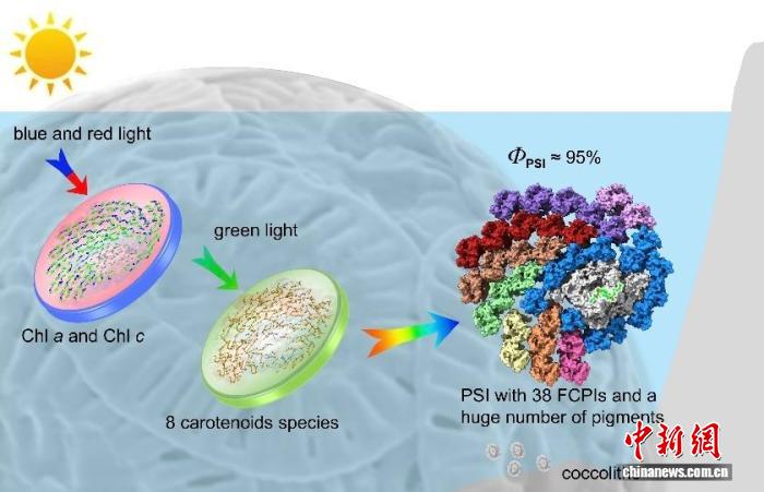颗石藻光系统I-捕光天线超大复合物结构及其能量转化效率示意图。中国科学院植物研究所 供图