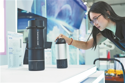 参观者在看“水环境侦察兵”的地表水及排水管网监测终端。记者 洪星摄