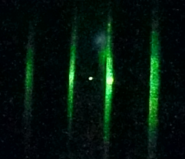 一个由玻璃制成的纳米粒子(照片中心附近的白点)被限制在聚焦激光束产生的光势中。通过检测纳米粒子散射的光,研究人员测量了其质心运动。图片来源:日本东京大学