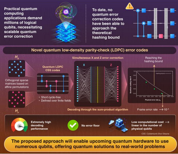 日本东京理科大学团队在量子纠错技术方面取得重要突破:开发出一种高效且可扩展的量子低密度奇偶校验(LDPC)纠错码,在包含数十万个逻辑量子比特的系统中仍保持极高的稳定性,性能接近理论界限。这一成果为实现大规模容错量子计算提供了关键技术支撑,有望推动量子计算机在量子化学、密码分析和复杂优化等领域的实际应用。