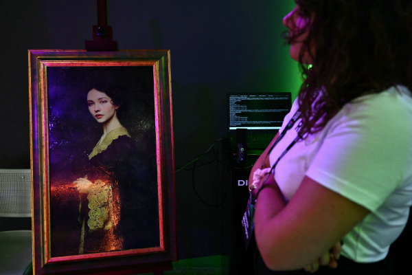 10月3日,一幅由人工智能创作的数字画作在意大利都灵展出。(法新社)