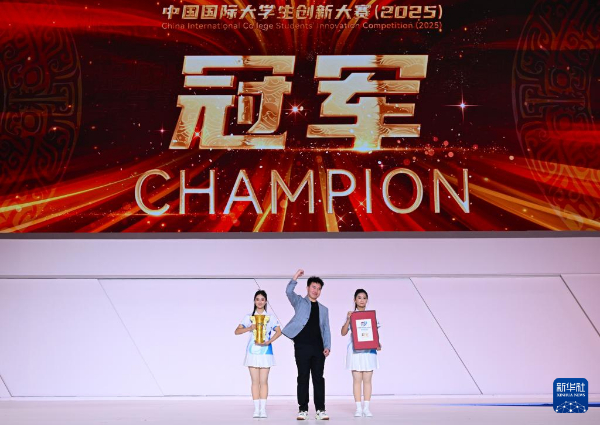 10月15日,在中国国际大学生创新大赛(2025)冠军争夺赛冠军颁奖现场,清华大学的“基于类脑架构的下一代通用模型及智能体生态”项目获得冠军。新华社记者 郝源 摄
