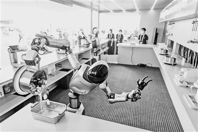 机器人不只会炒菜。在北京首家机器人主题餐厅“机器人焰究所”,舞台上,由机器人键盘手、机器人吉他手、机器人鼓手和机器人贝斯手组成的机器人乐队,正奏出一首首流行乐曲;后厨里,煎饼果子机器人、奶茶机器人、咖啡机器人、烤串机器人等一众“大厨”正忙着制作各式各样的餐饮。