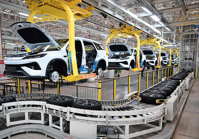 在郑州航空港区比亚迪总装工厂拍摄的新能源汽车生产线(2025年11月3日摄)李嘉南摄/本刊