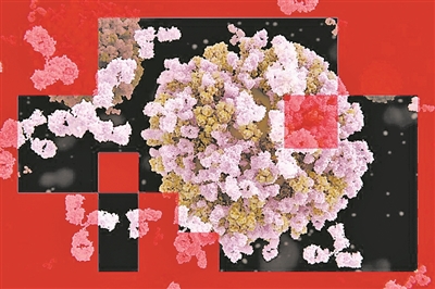 抗体(粉红色)与流感病毒(棕色)结合示意图。图片来源:《自然》网站