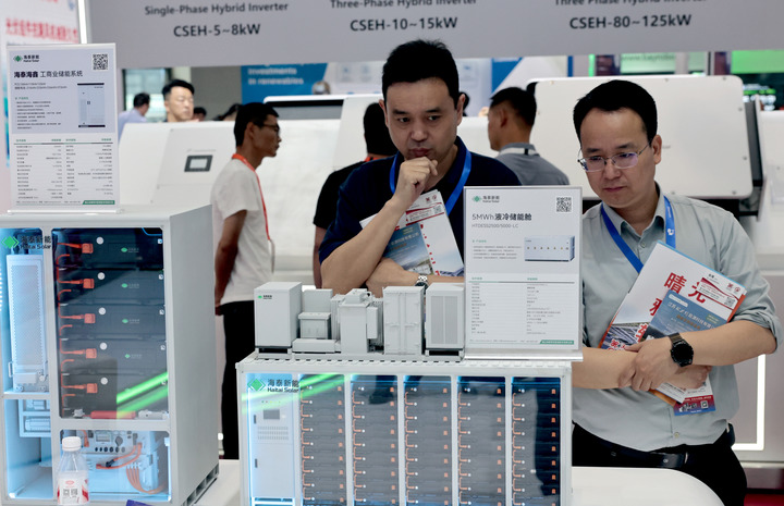 6月12日,第十八届国际太阳能光伏和智慧能源&储能及电池技术与装备(上海)展览会在国家会展中心(上海)举行。图为参观者在一组储能设备模型展品前驻足观看。(新华社)