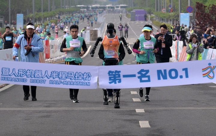 2025年4月19日,2025北京亦庄半程马拉松暨人形机器人半程马拉松在北京亦庄举行,图为天工队选手天工Ultra(左三)在比赛中冲向终点。(李贺 摄)