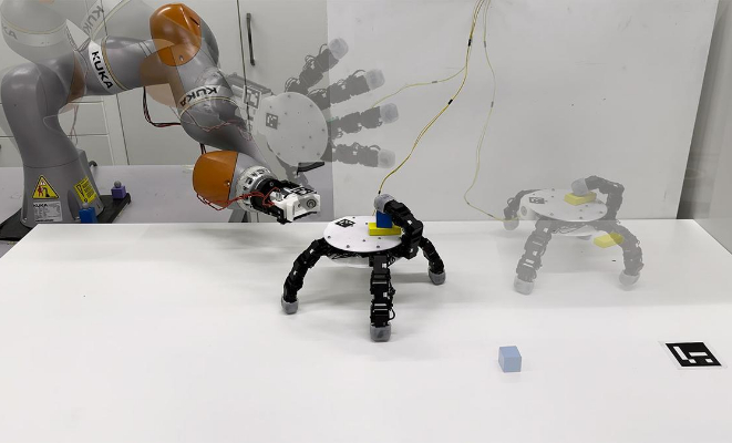 “巧手机器人”可从机械臂上分离,爬行拾取多个物体并重新与机械臂连接。图片来源:EPFL
