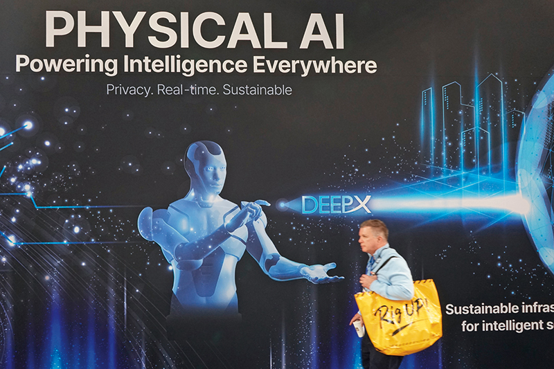 一名男子在2026年美国拉斯维加斯消费电子展上走过印有“物理 AI”字样的展台(2026年1月7日摄)新华社发(曾慧摄)