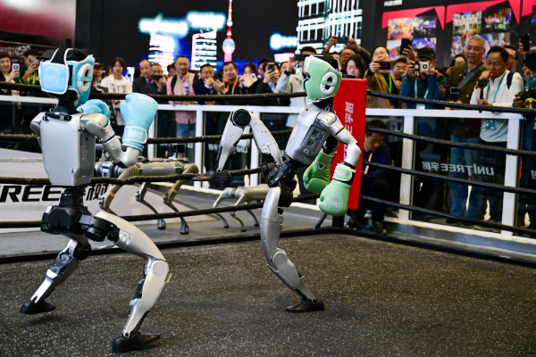 2025年11月6日,在第八届进博会宇树科技展台,人形机器人进行格斗表演。(新华社)