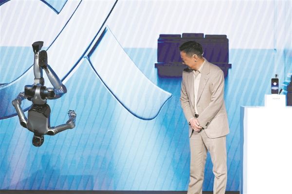 当地时间3月1日,全球最大移动技术展会世界移动通信大会(MWC)开幕前夕,中国消费电子企业荣耀在巴塞罗那发布首款人工智能驱动的“机器人手机”。视觉中国供图