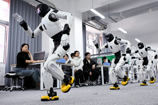 3月26日,在青岛职业技术学院具身智能机器人实训基地,人形机器人在课堂上进行动作编程效果演示。(新华社)
