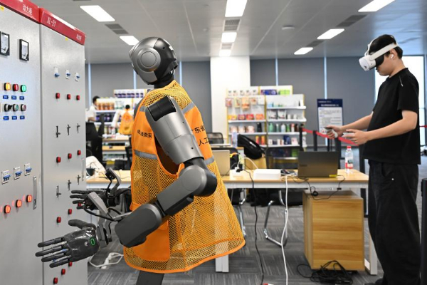 在广州海珠区的广东省具身智能训练场,工作人员在模拟环境下训练机器人进行电力设备巡检与维护。新华社记者 邓华 摄