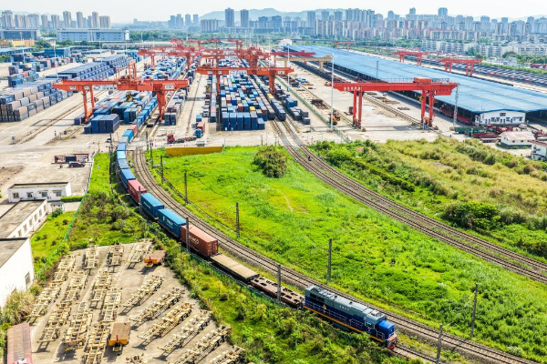 4月23日,一列装载汽车配件、机械机具等货物的中欧班列在重庆团结村站顺利发车(无人机照片)。新华社记者 唐奕 摄
