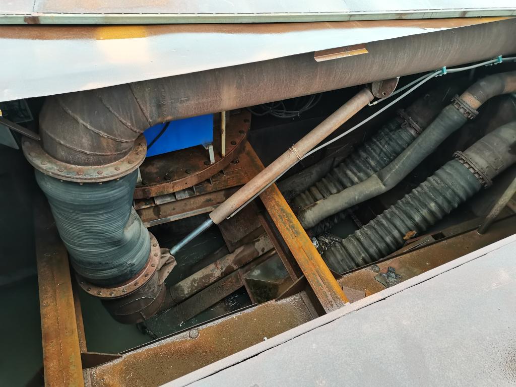记者在长江上见到了这艘由小型运输船改装而成的涉案“隐形”采砂船,发现其抽砂泵隐藏在船舱内,只有在非法采砂作业时才将抽砂管安装起来。
