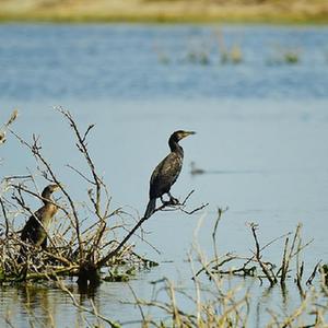 两只鸬鹚在乌伦古湖国家湿地公园休憩(7月17日摄)。新华社记者 侯昭康 摄
