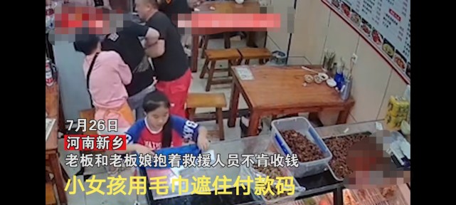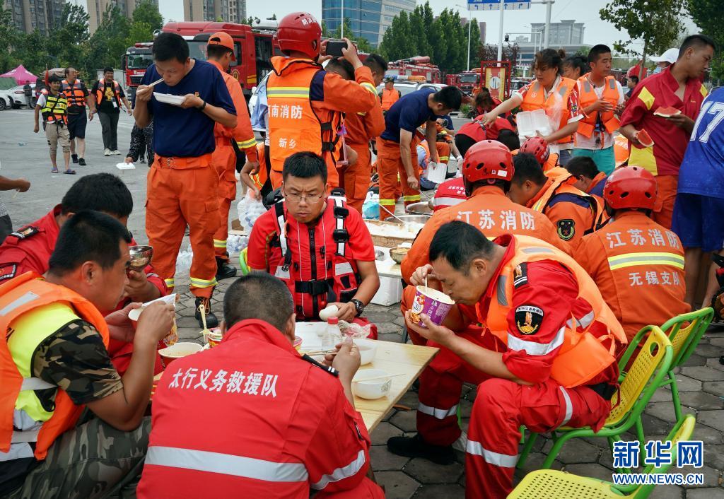 ↑7月28日,救援人员在卫辉市明珠花园小区居民开设的就餐点吃饭。
