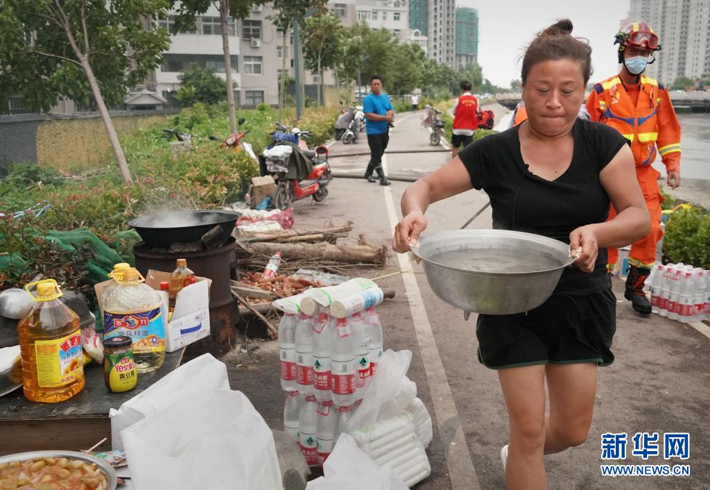 ↑7月28日,卫辉市明珠花园小区居民孙庆新在准备烧水为救援人员煮面。