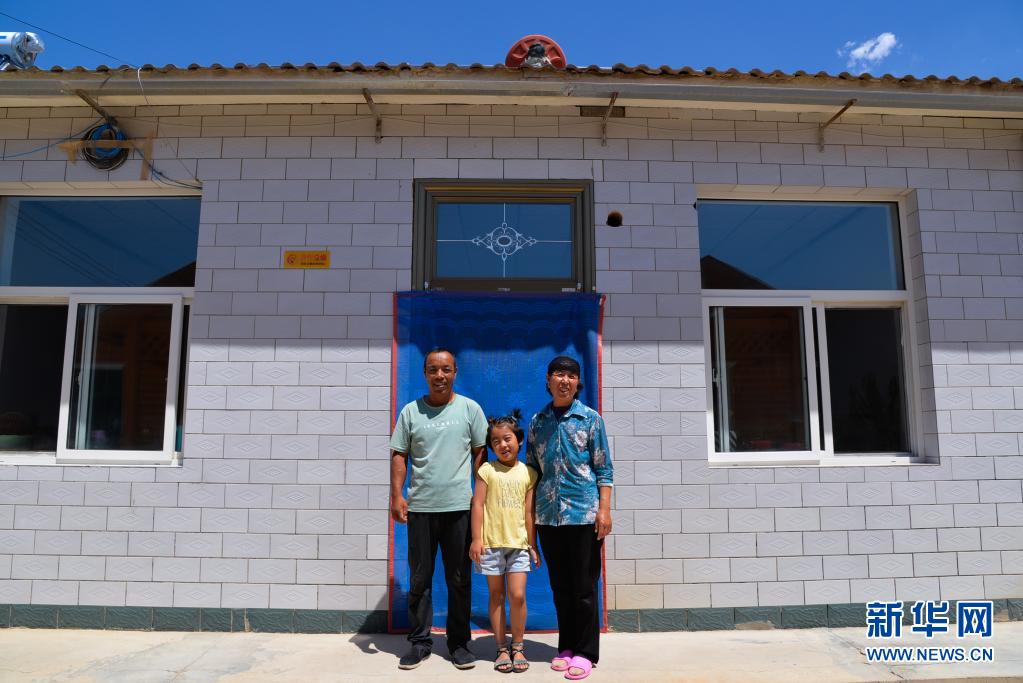 宁夏吴忠市红寺堡区红寺堡镇弘德村村民刘克瑞(左)和妻子(右)、孙女在自家门前(7月29日摄)。新华社记者 徐钦 摄