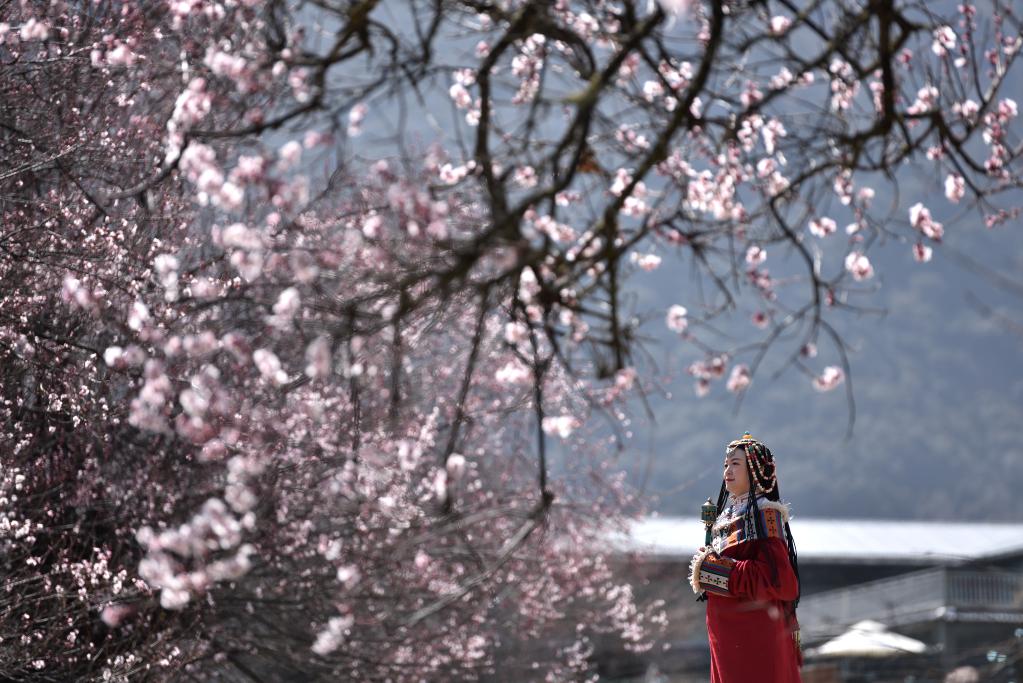 一名游客在西藏林芝市索松村观赏桃花(2021年3月28日摄)。 新华社记者 孙瑞博 摄
