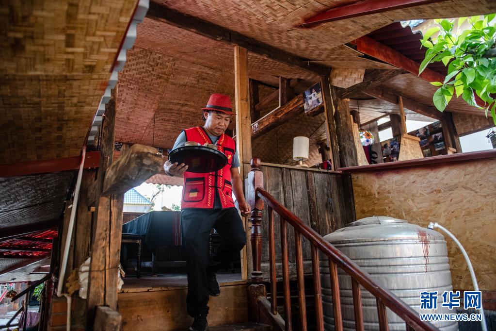 在云南省临沧市双江县的“牛圈咖啡馆”,老板艾芒在招待客人(4月28日摄)。新华社记者 胡超 摄
