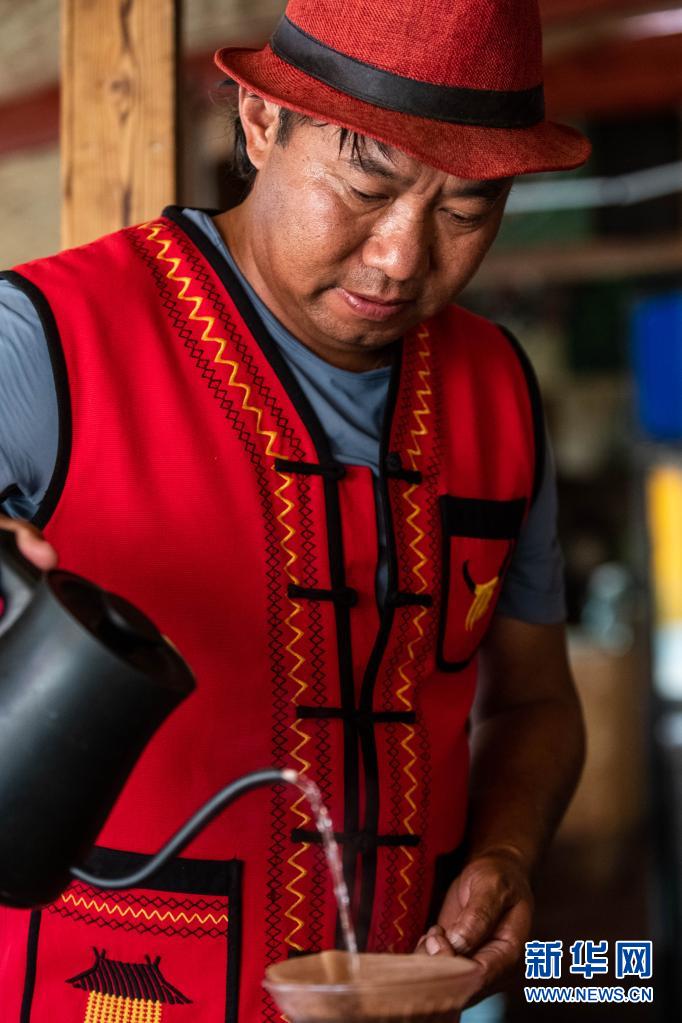 在云南省临沧市双江县的“牛圈咖啡馆”,老板艾芒在冲泡咖啡(4月28日摄)。新华社记者 胡超 摄