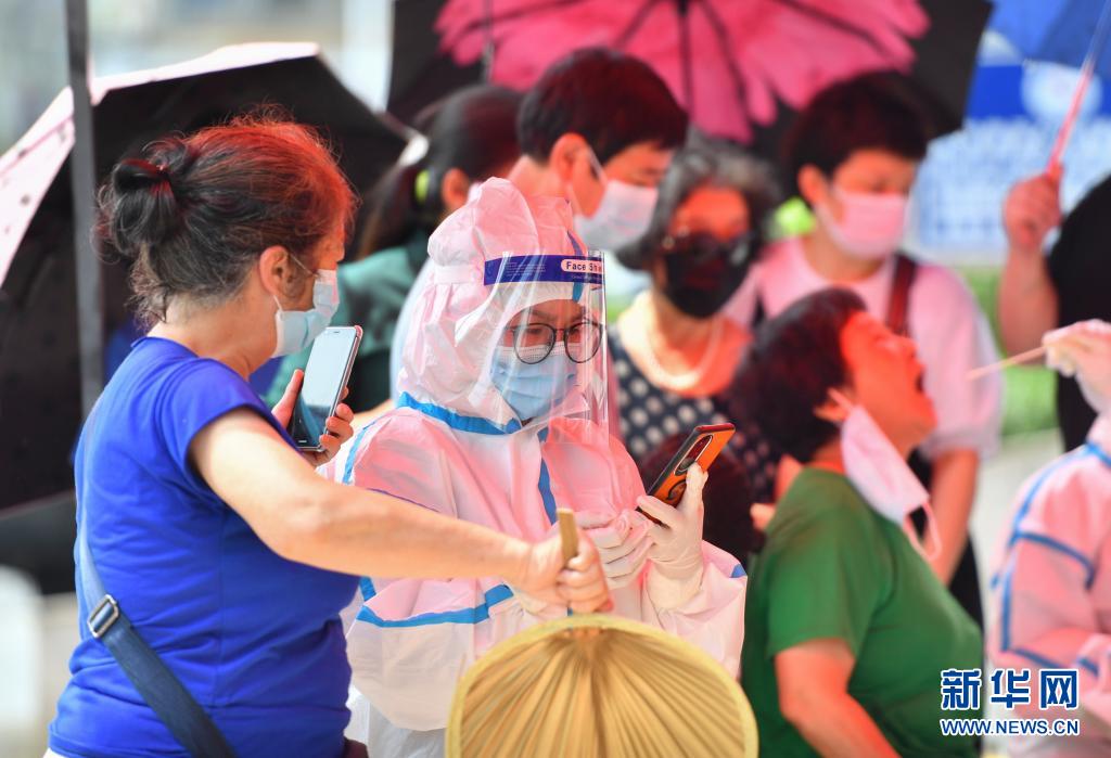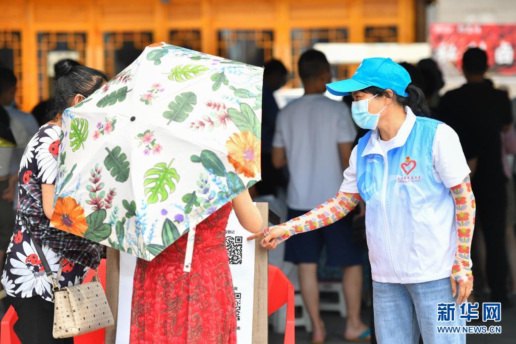 7月31日,在长沙市天心区赤岭路街道白沙花园社区核酸检测点,志愿者引导居民扫码登记身份信息。新华社记者 陈泽国 摄