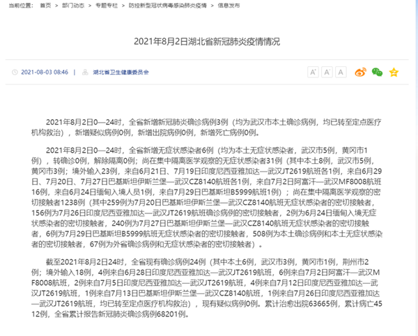2021年8月2日0—24时,全省新增新冠肺炎确诊病例3例(均为武汉市本土确诊病例,均已转至定点医疗机构救治),新增疑似病例0例,新增出院病例0例,新增死亡病例0例。