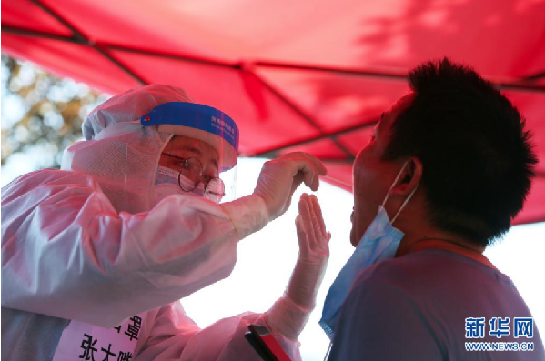 8月2日,在郑州市郑东新区一个核酸检测点,医务人员为市民进行核酸检测取样。